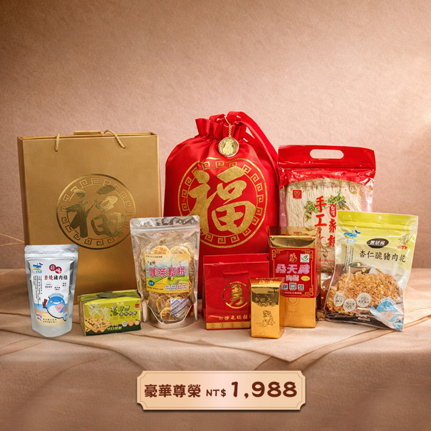 吉祥話金磚米禮盒*1盒、豬肉乾*1包、蓬萊鬆餅*1包、手工麵*1包、白沙屯媽祖金磚米*1塊、青葱脆餅*1盒、文創小物*1個、福袋*1個、加碼豬肉條*1包。