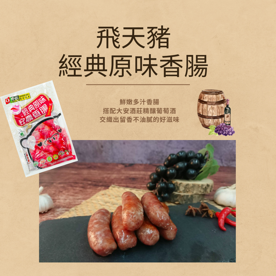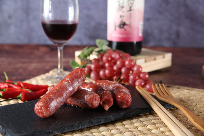 嚴選當日現宰新鮮國產豬後腿肉,搭配天然豬腸衣,以三分肥、七分瘦的完美比例,再加入大安酒莊以法式傳統釀造之葡萄酒,經二次蒸餾所萃取酒精濃度58之最精華部分長時間醃漬入味,入口後酒香四溢、口感紮實不油膩。