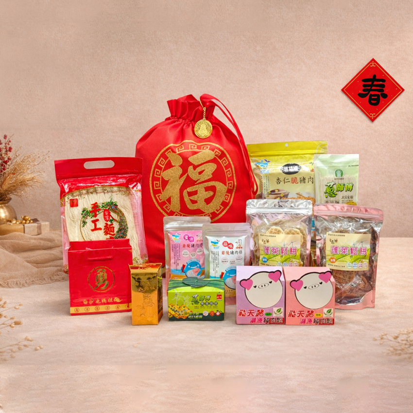 | 內容物 | 豬肉乾*2包、隨身包肉鬆*2盒、蓬萊鬆餅*2包、手工麵*1包、白沙屯媽祖金磚米*1塊、青葱脆餅*1盒、文創小物*1個、福袋*1個。 |