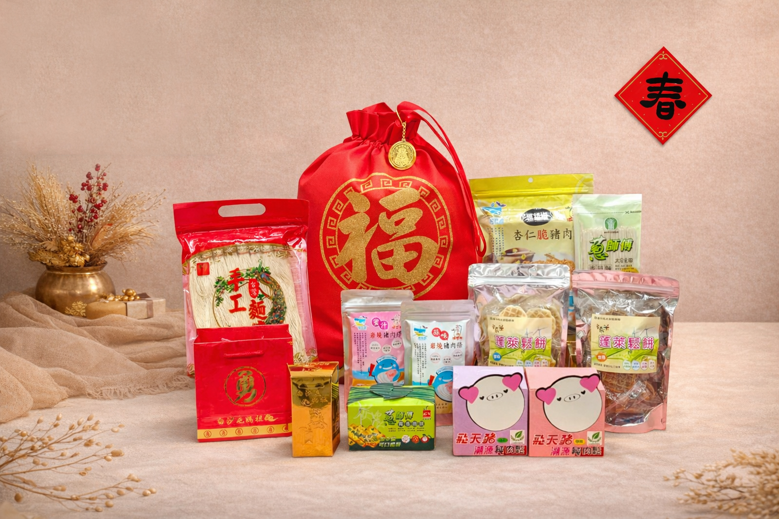 豬肉乾*2包、隨身包肉鬆*2盒、蓬萊鬆餅*2包、手工麵*1包、白沙屯媽祖金磚米*1塊、青葱脆餅*1盒、文創小物*1個、福袋*1個
