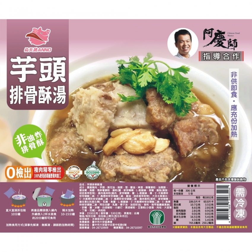 與台灣最年輕的國宴名廚阿慶師攜手開發「芋頭排骨酥湯冷凍調理包」,芋頭排骨酥湯可謂是從產地到餐桌的代表作,排骨酥使用無油炸技術,熱量低,有別於傳統高熱量排骨酥湯,深受女性喜愛。簡單加熱,排骨軟嫩,加上大安產區的檳榔心芋,Q綿不過於鬆軟,讓人驚艷。