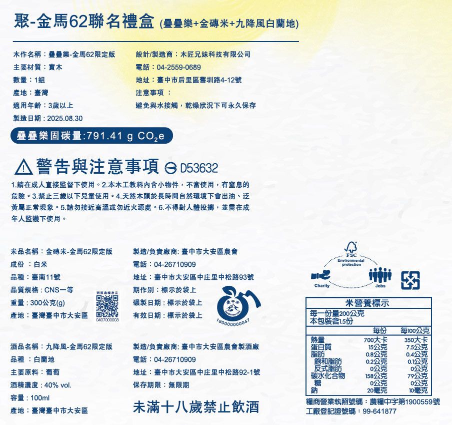 食品效期: 1.金磚米 一年(依出廠包裝上效期為主) 2.九降風白蘭地 無限期