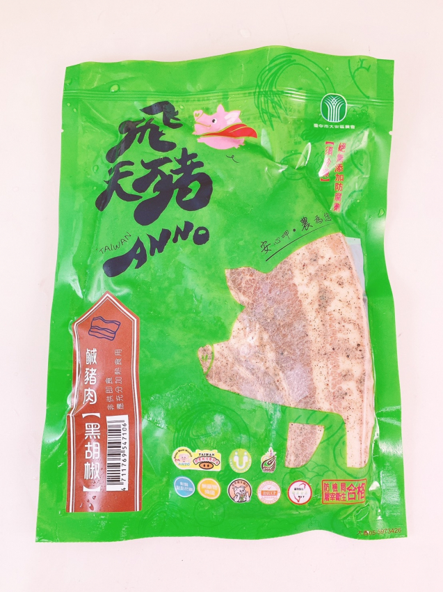 採用臺中市大安區肉品市場電宰衛生豬三層肉,肥瘦分明。加入調味料後冷藏滾打按摩,並維持低溫4℃新鮮冷藏醃製3天,待完整入味後立即真空包裝保持新鮮美味。低鹽配方下鍋前不必水洗,低溫油煎至表面焦黃,香味四溢令人食指大動。